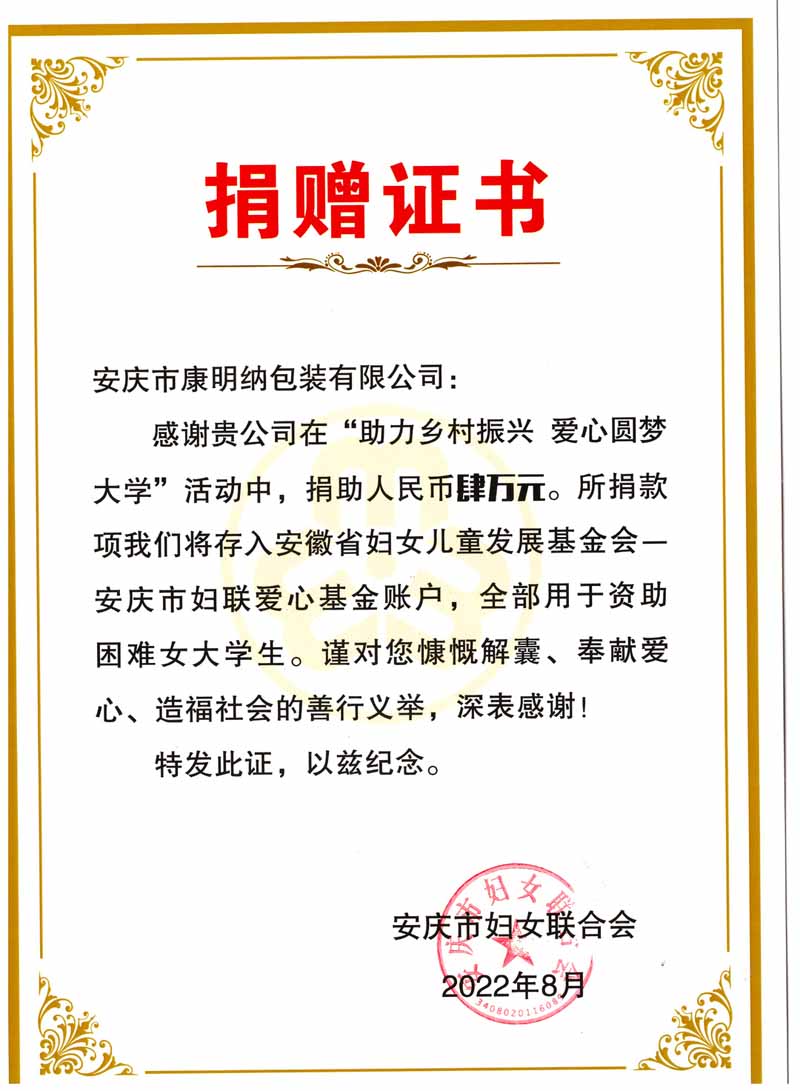 Desde 2019, Anqing Kangmingna Packaging Co., Ltd. ha donado subvenciones a estudiantes universitarios pobres durante cuatro años consecutivos, con una financiación de casi 200 000 yuanes. Con el fin de ayudar de manera efectiva a las estudiantes universitarias pobres a ingresar sin problemas al campus, se donaron 40.000 yuanes en la actividad. Con la educación como base, KangmingNA DURANTE los años en el cultivo profundo de la industria, pero también se adhiere a la donación de la educación, el alivio de la pobreza, toma la iniciativa para desempeñar el papel de la empresa, la dedicación sincera del amor empresarial. En el futuro, Kangmingna continuará participando activamente y realizando diversas formas de actividades de alivio de la pobreza de bienestar público, y asumirá mejor la responsabilidad social de las empresas privadas.